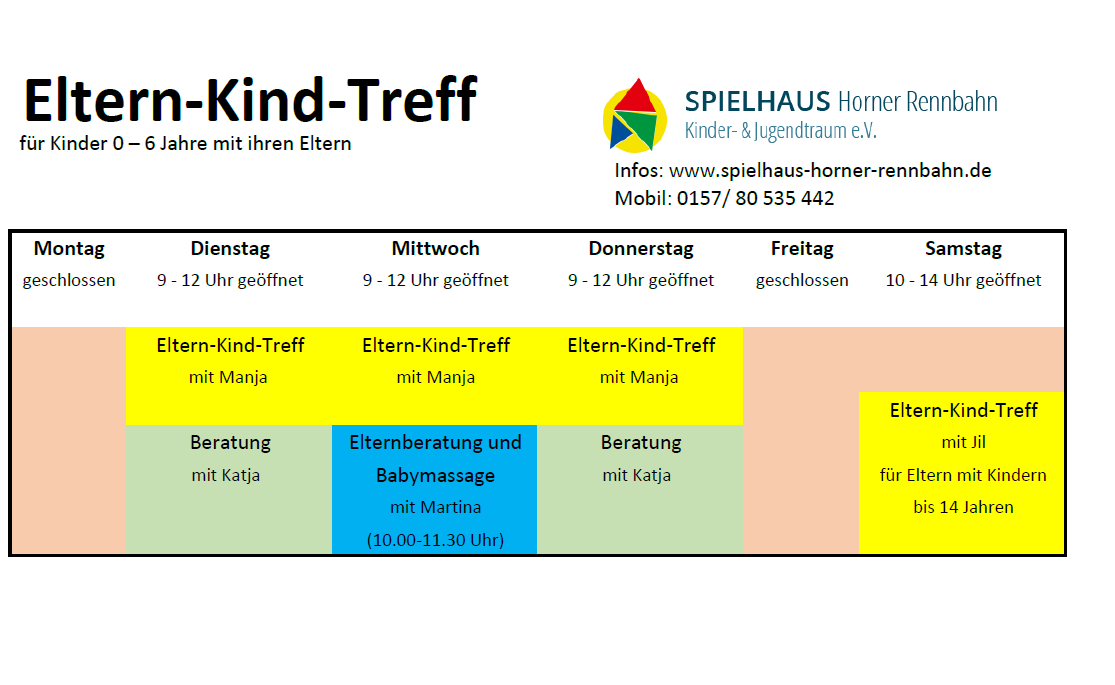 Für Eltern mit Kindern von 0-5 Jahren bieten wir verschiedene Angebote wie Elternberatung (Dienstag + Donnerstag 9.00-12.00 Uhr mit Katja von Fabi, Flyer siehe weiter unten), Babymassage mit Hebamme Martina, Frühstück, Basteln und Bewegung an. Das Spielhaus ist ein Ort, an dem sie mit ihrem Kind spielen und sich mit anderen Eltern austauschen können.