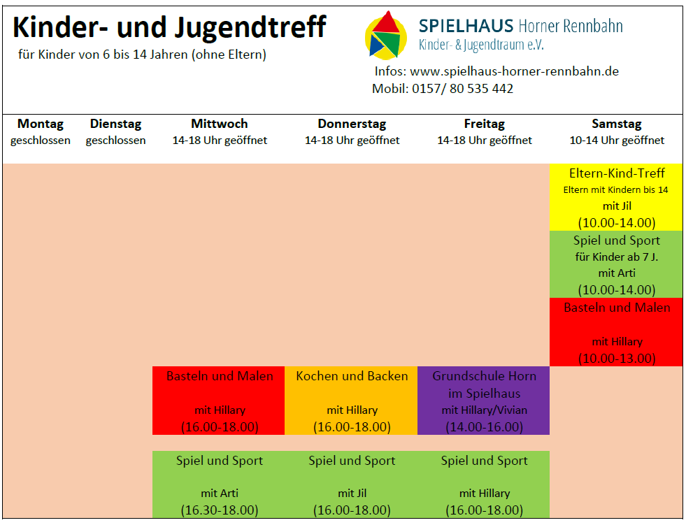 samstags machen wir ein kleines Spiel- und Sportangebot. Bei gutem Wetter könnt ihr draußen vor dem Spielhaus Fahrrad fahren. Bei Regen treffen wir uns 11.00 Uhr im Spielhaus und gehen gemeinsam in die Turnhalle der Grundschule Horn (Rhiemsweg 61). Bitte nehmt was zu Trinken und Hallenturnschuhe mit.